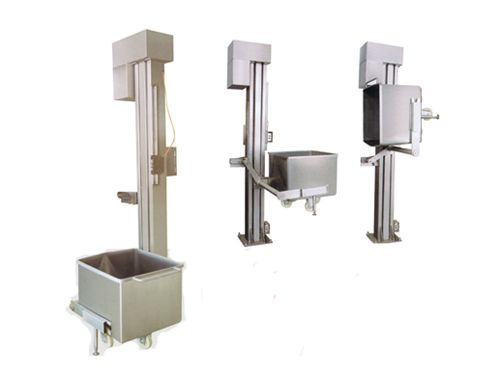提升机是为灌肠机、搅拌机、绞肉机等设备提供提升物料的专用设备。本机采用不锈钢制作,提升运动原理采用链条式提升方式提升或下降。